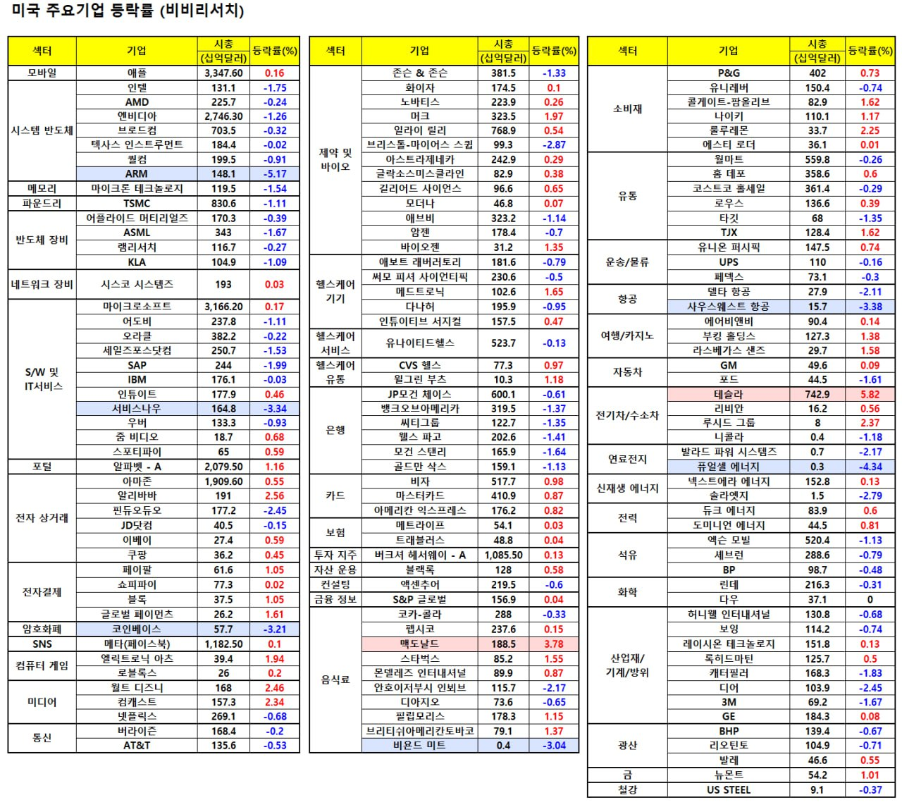 - 반면 온 세미컨덕터(+11.54%)는 예상을 상회한 실적과 CEO의 다음 분기 강력한 실적 전망에 힘입어 급등.