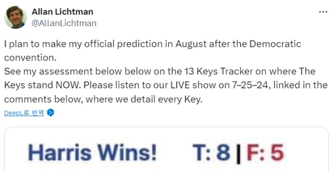 최근 美 대선 10번 중 9번 맞춘 ‘족집게’ 교수, “해리스가 트럼프 이긴다”적중률 90% 美 대선 예언가 해리스가 트럼프 이긴다 Can Harris beat Trump? Presidential prognosticator's prelim