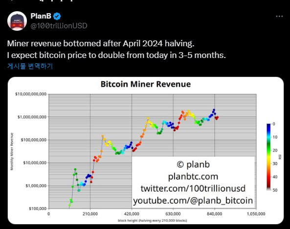 유명 암호화폐 분석가 플랜B가 비트코인 가격이 연말까지 두 배 상승할 것으로 전망했다. 플랜B는 29일(현지시간) 엑스에 "채굴자들의 수익이 4월 반감기 이후 바닥을 찍었다"면서 "비트코인 가격