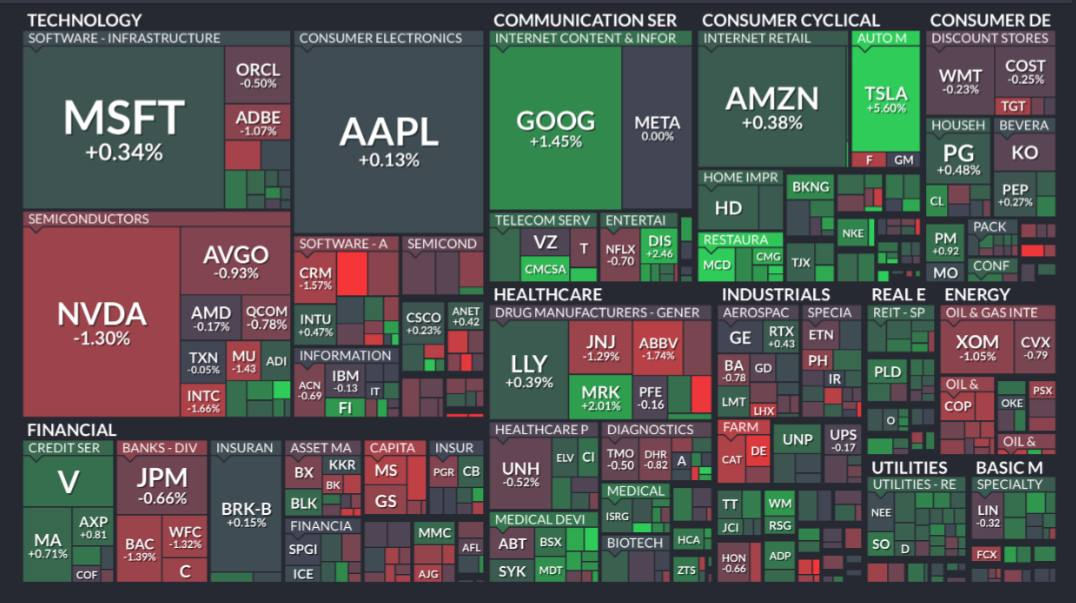 - 다우지수 0.1% 하락, S&P 500 0.1% 상승, 나스닥은 0.1% 상승.