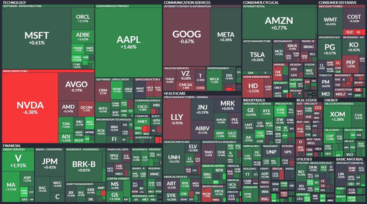 - 더불어 AI 산업의 확장은 지속될 것이라는 분석에 반도체 업종이 강세를 보였고, 여기에 애플(+1.46%) 등 개별 이슈에 강세를 보인 종목군의 영향도 이어져 상승 지속.