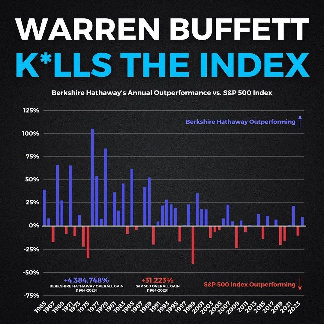 - 1964년부터 2023년까지 거의 60년 동안 버크셔 해서웨이는 무려 4,384,748%의 수익률을 올렸고, S&P 500의 전체 수익률 31,223%를 크게 앞질럿습니다.