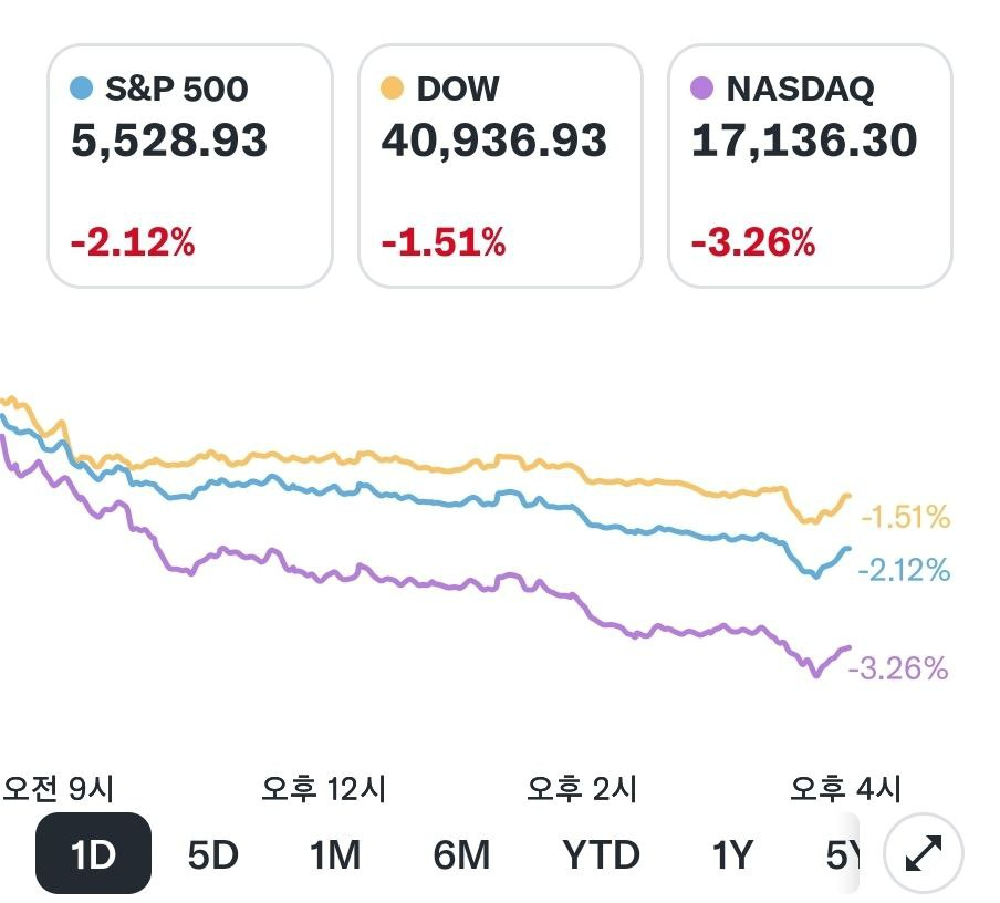 - 미국 뉴욕증시, 경기침체 우려 재점화·빅테크 투매…S&P 2.12%↓·나스닥종합 3.25%↓·다우존스 1.51%↓, 서학개미 테슬라 171억원↑