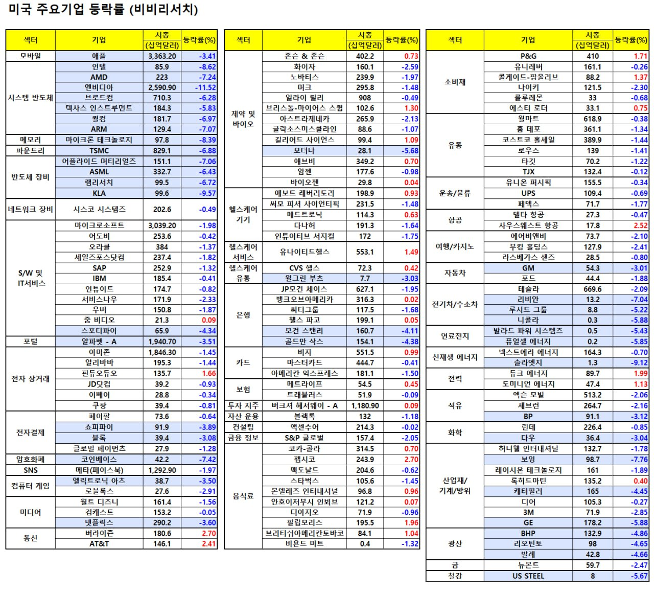 - 엔비디아(-9.53%), 브로드컴(-6.16%), AMD(-7.82%), 마벨테크(-8.16%), 마이크론(-7.96%), 인텔(-8.80%), 램리서치(-6.73%), AMAT(-7.04%), TSMC(-6.53%), ASML(-6.47%), ARM(-6.88%) 등 반도체 업종은 급락.