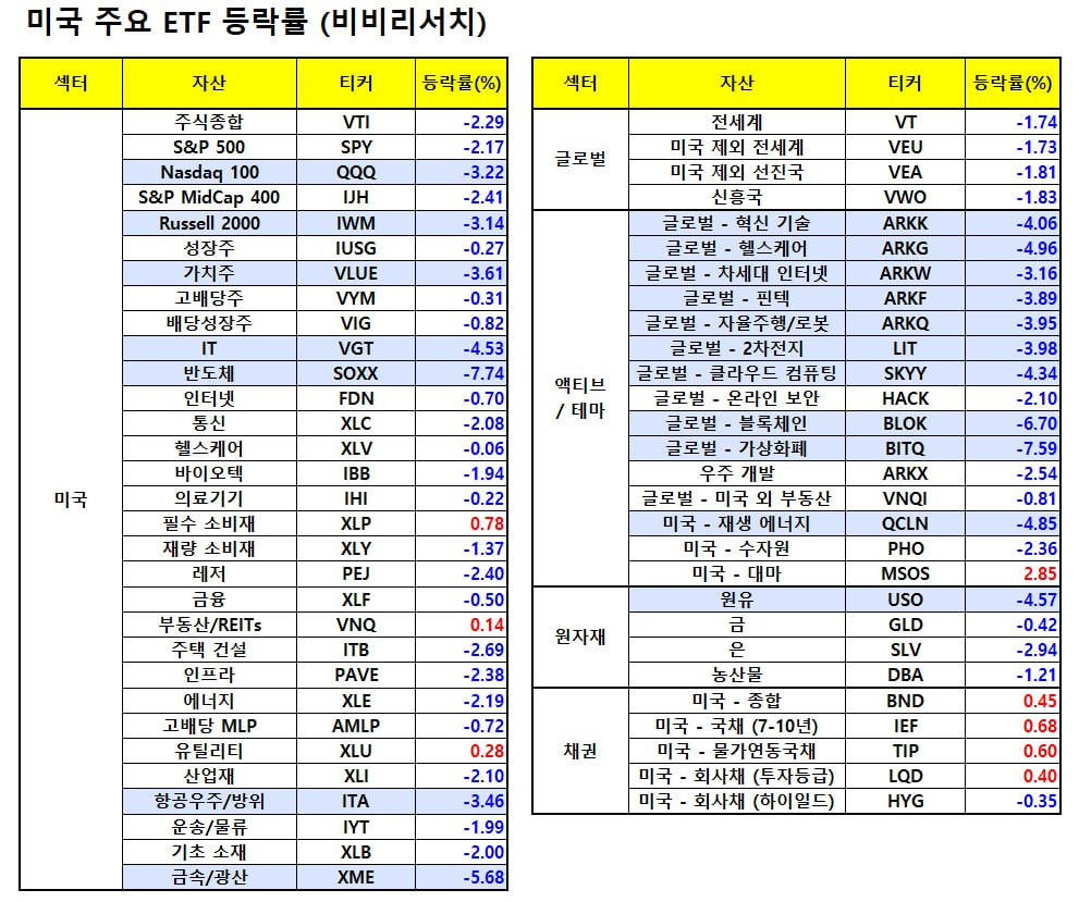 - 리비안(-6.94%), 앨버말(-6.79%) 등 전기차 관련 종목군도 부진. 보잉(-7.32%)은 웰스파고가 투자의견 매도로 하향 조정한 여파로 급락.