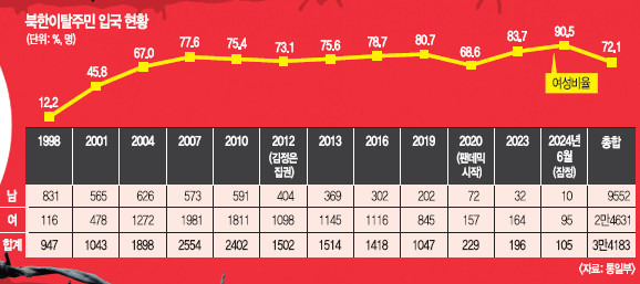 1. 북한 이탈주민 90%가 여성 → 올 6월까지 105명 중 90.5%에 달하는 95명이 여성. 초창기 10%대에서 2000년대 초반 절반 넘어서기 시작, 지금은 90% 넘어. 경제적 궁핍, 남성 중심 북 사회에 대한 환멸, 비교적 덜한 감시 등이 이유.(국민)▼
