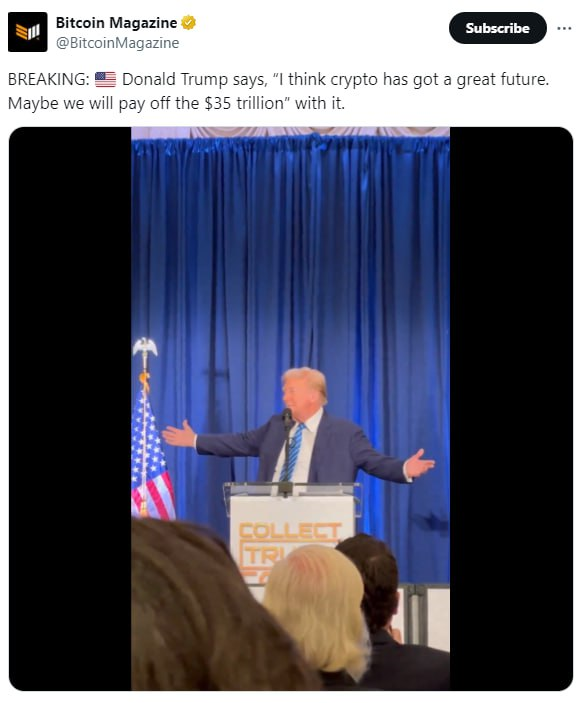 - 도널드 트럼프 : "암호화폐에는 훌륭한 미래가 있다고 생각합니다. 어쩌면 우리는 35조 달러를 갚을 수 있을지도 모릅니다."