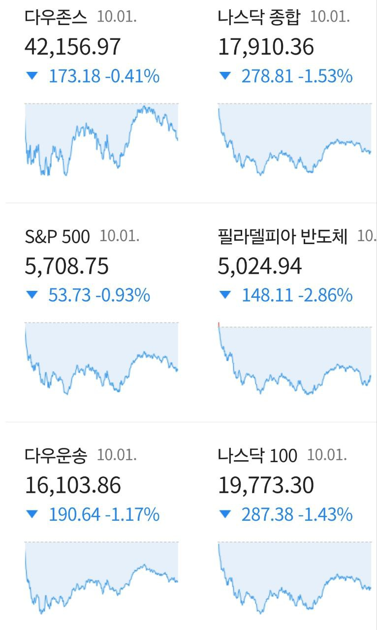 - 10/02 미 증시, 항만 파업과 이란의 이스라엘 공격으로 반도체 등 기술주가 하락 주도
