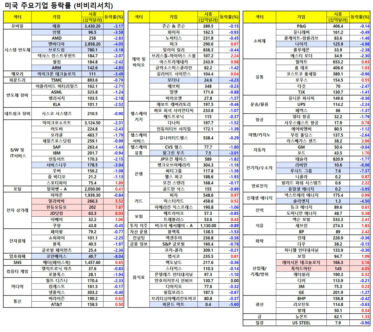 - 브로드컴(-2.92%), 마이크론(-3.28%), 인텔(-3.28%), AMD(-2.64%) 등도 동반 하락. 필라델피아 반도체 지수는 2.86% 하락