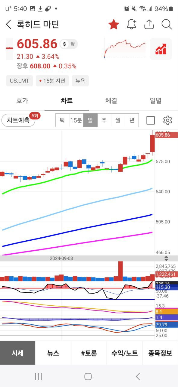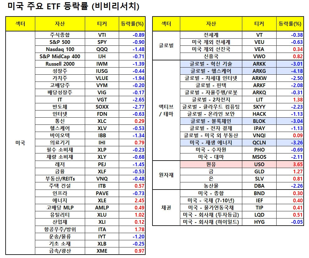 - 노스롭그루먼(+2.99%), 록히드마틴(+3.64%), L3 해리스(+3.12%) 등 방위 업종은 중동 불안 여파로, 엑슨모빌(+2.31%), 코노코필립스(+3.88%) 등 에너지 업종은 관련해서 국제유가 급등하자 강세.