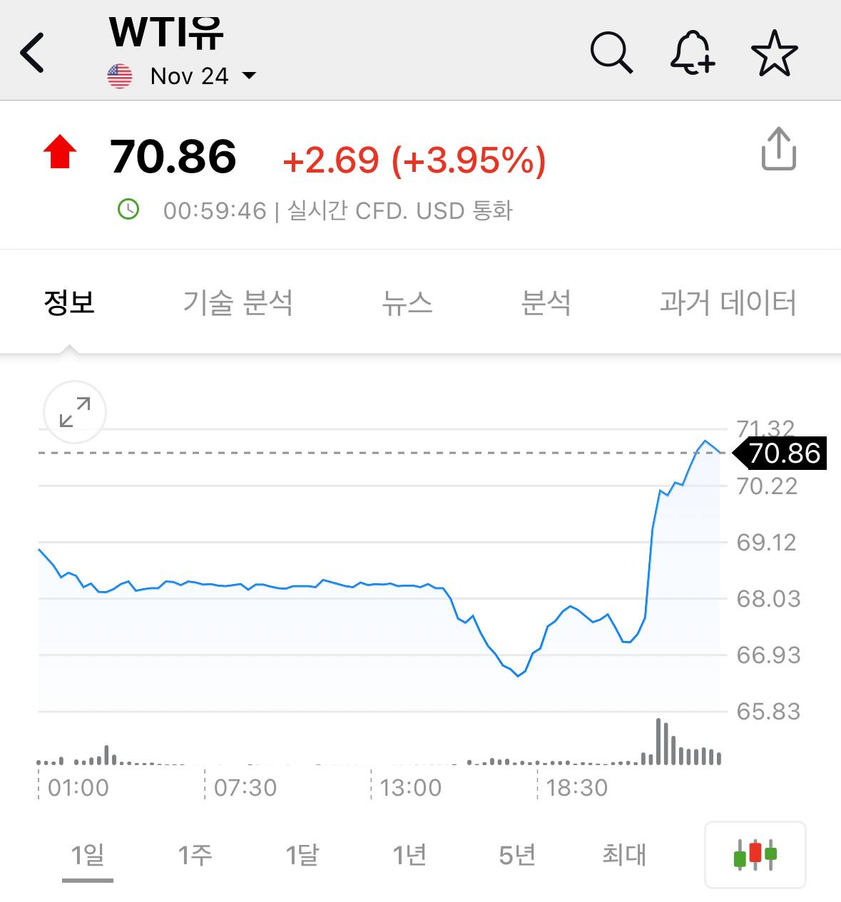 - 국제 유가는 급등세로 나타나, 11월 인도분 서부텍사스산원유 (WTI) 가격은 전장 대비 3.04% 상승한 배럴당 70.24달러 기록