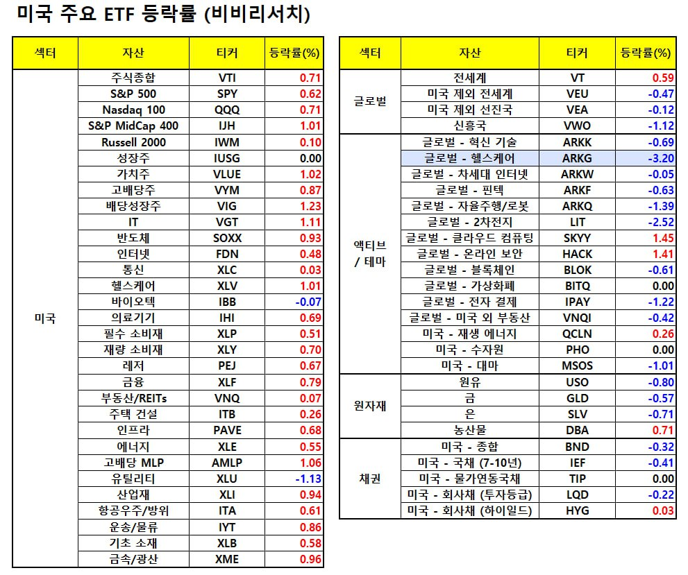 - 아마존(+1.34%)은 목표주가 하향 조정에도 불구하고 단일약 처방 배송 서비스를 확대했다는 소식에 강세.