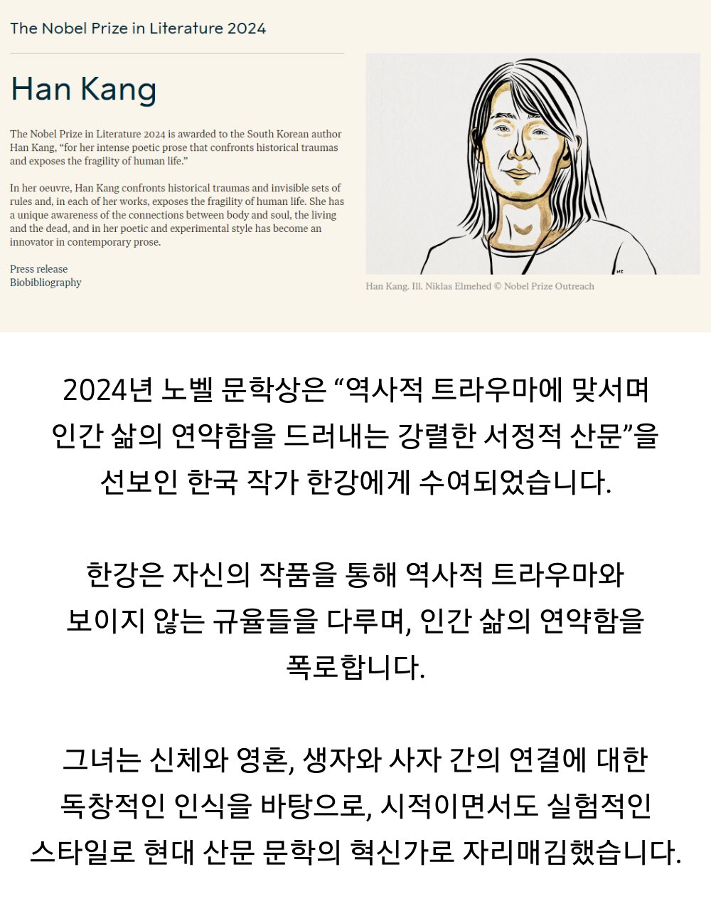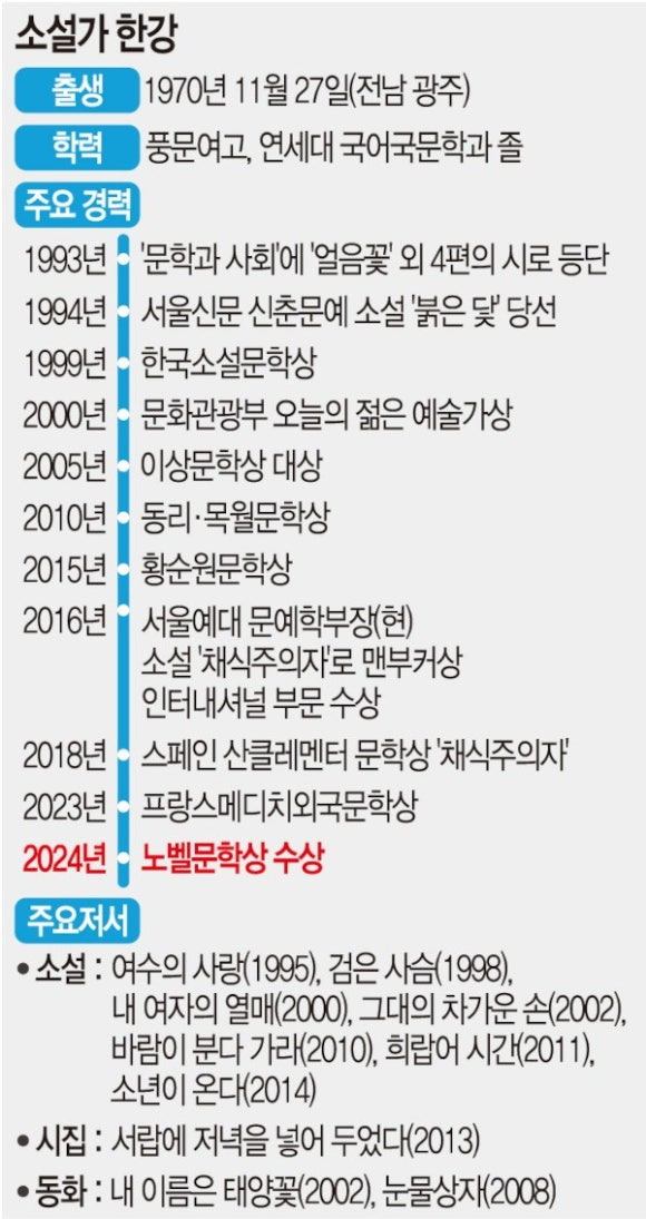1. '한강의 기적' 이뤄졌다 → 소설가 한강, 노벨문학상. 후보로 거론된 26명의 작가 중 한강의 이름은 없었다. 누구도 예상하지 못한 ‘깜짝 수상’... BTS·임윤찬·봉준호 이어 한강까지…'초일류 문화강국' 된 한국, K콘텐츠의 힘…세계를 감동시키다.(한경 외)▼