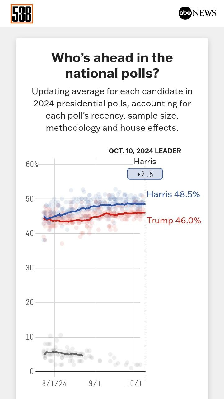 (참고로 폴리마켓은 크립토, PredictIt은 USD로 결제해서 사람들 사이에서 폴리마켓은 부정확하고 PredictIt을 봐라😒 이런 의견이 많았으나 PredictIt이 트럼프가 상위인것은 처음보네요 ) - 나머지 538, Nate Silver 웹사이트는 해리스가 이기고 있네요. 538도 격차가 좁네요