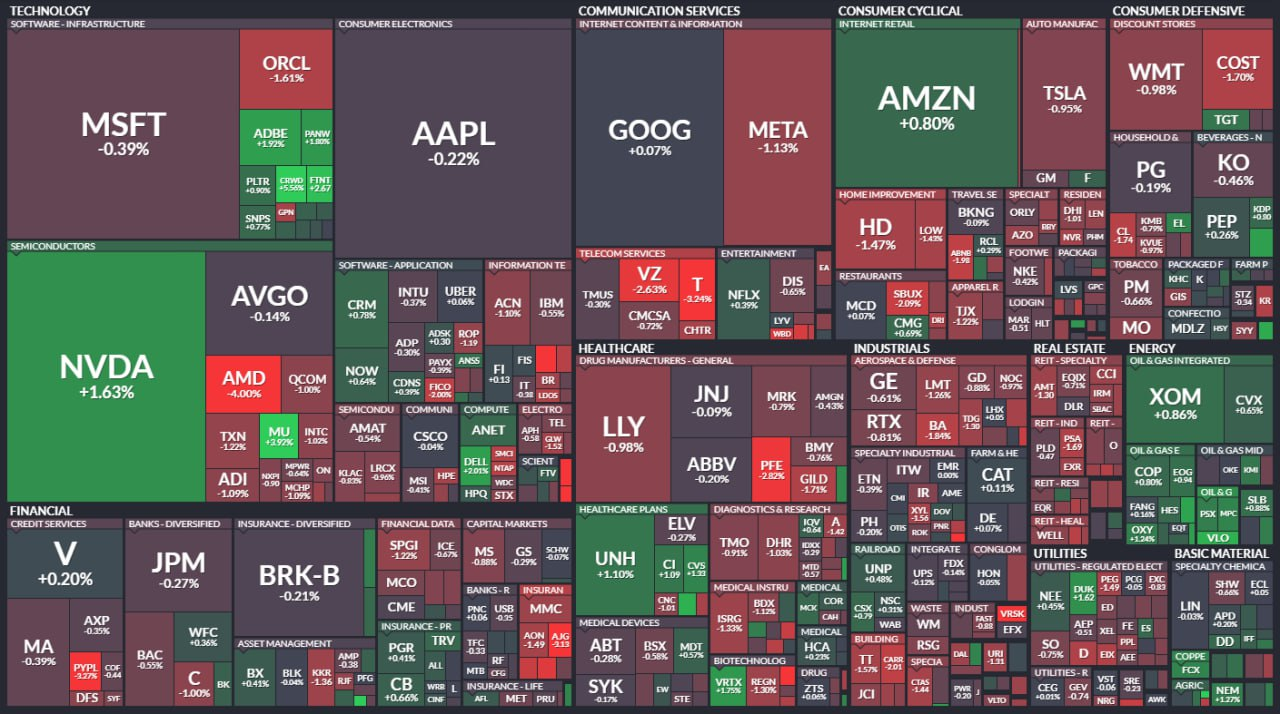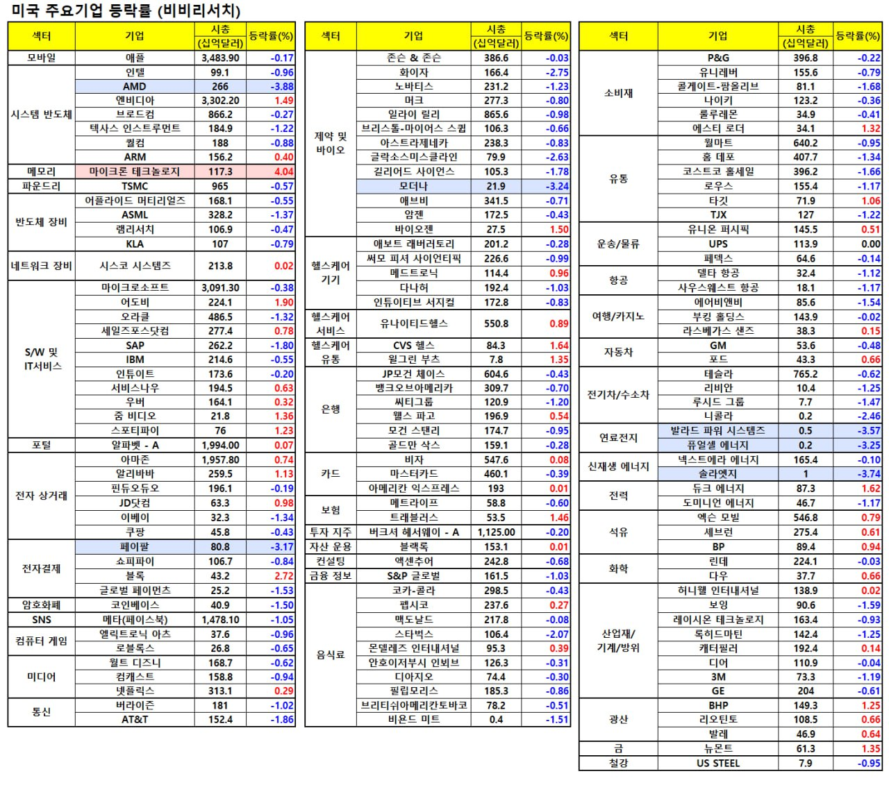 - 애플 0.2% 하락, 마이크로소프트 0.3% 하락, 메타 1.1% 하락, 브로드컴 0.1% 하락
