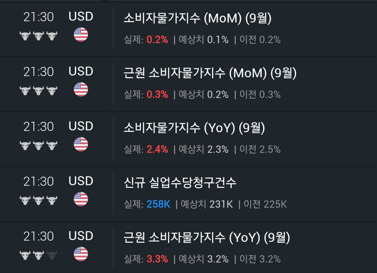 - 예상을 웃돈 미 9월 CPI보다 주간 고용지표 부진에 주목하며 금리가 내렸습니다.