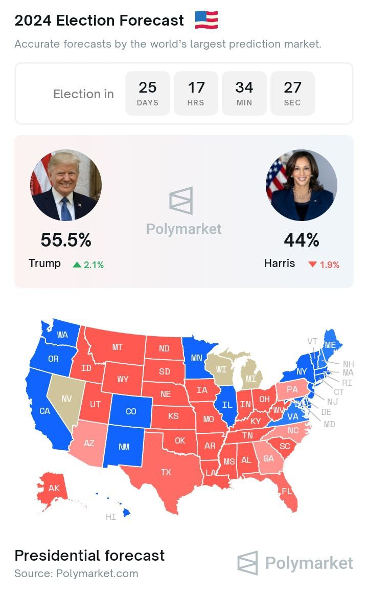 - 폴리마켓은 트럼프가 많은 격차로 이기고 있고 처음으로 PredictIt도 트럼프가 우위인 상황