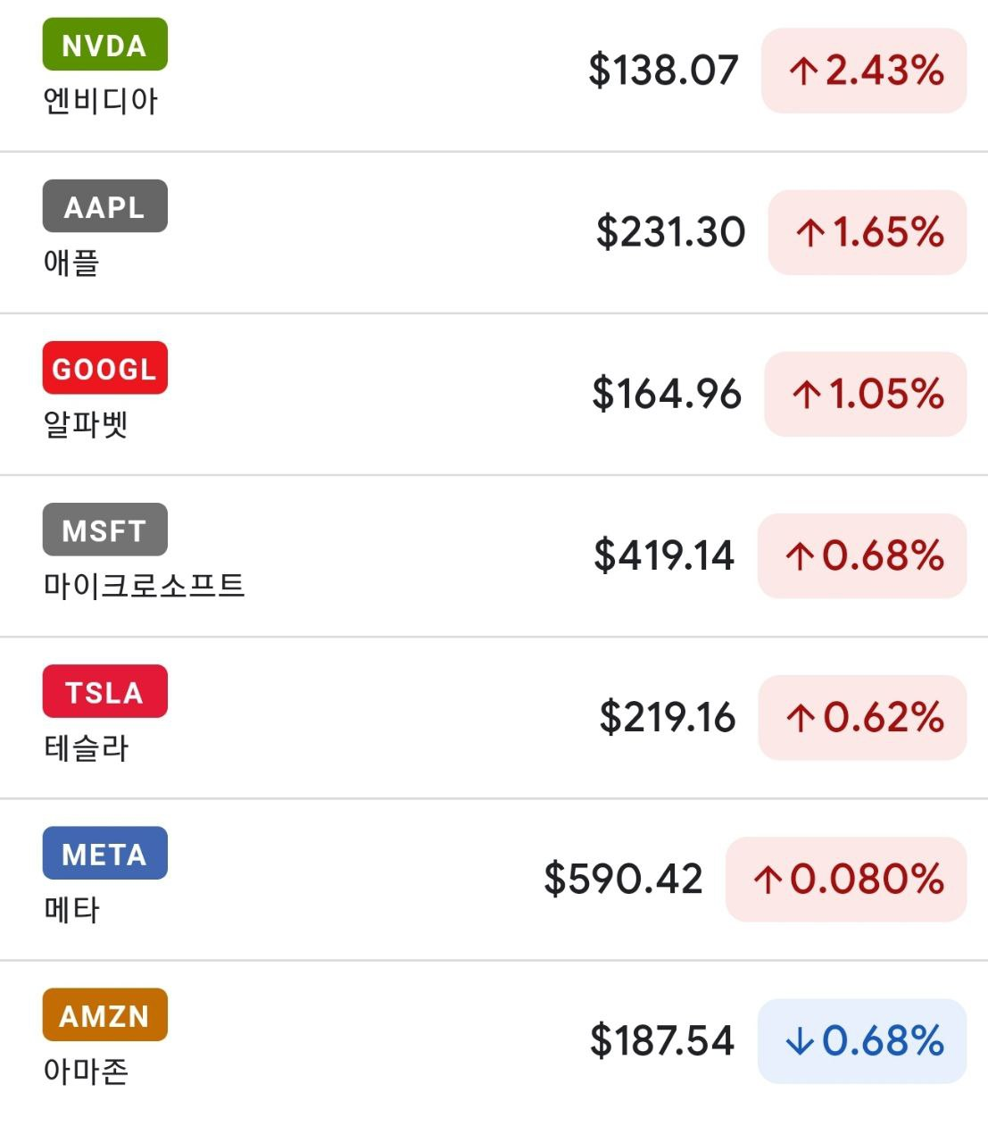 - 그 외 MS(+0.68%), 메타 플랫폼(+0.08%)은 소폭 상승을, 아마존(-0.68%)은 하락.