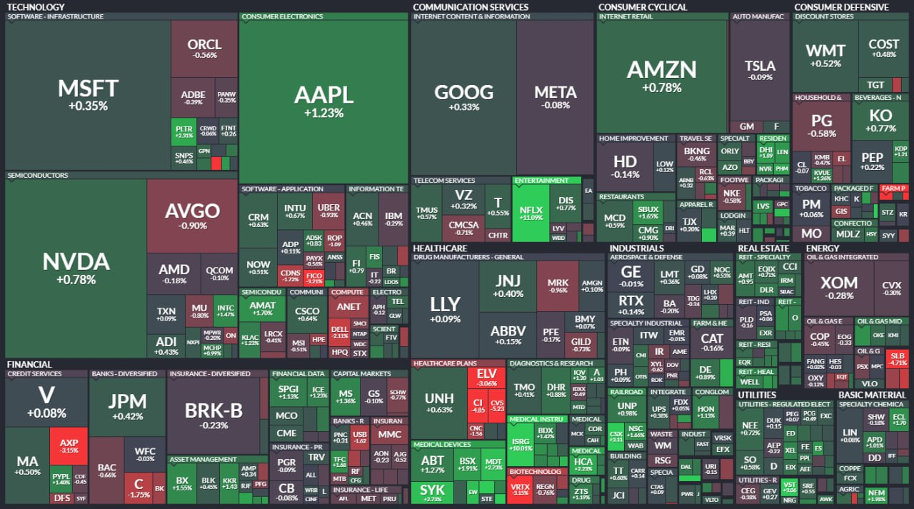 - 섹터 퍼포먼스: 11개 섹터 중 10개 상승 마감. 통신은 상승 주도하며 0.74% 상승. 에너지는 가장 부진하며 0.33% 하락.