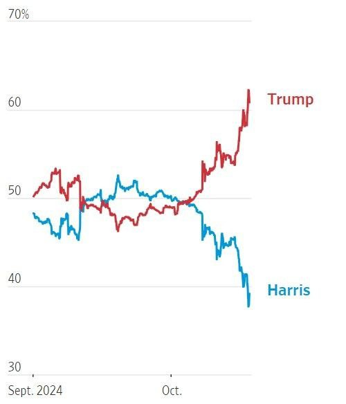 - 일부 베팅 사이트들이 트럼프 전 대통령의 당선 가능성을 60% 안팎까지 끌어올리면서 트럼프 트레이드 규모가 커졌다.