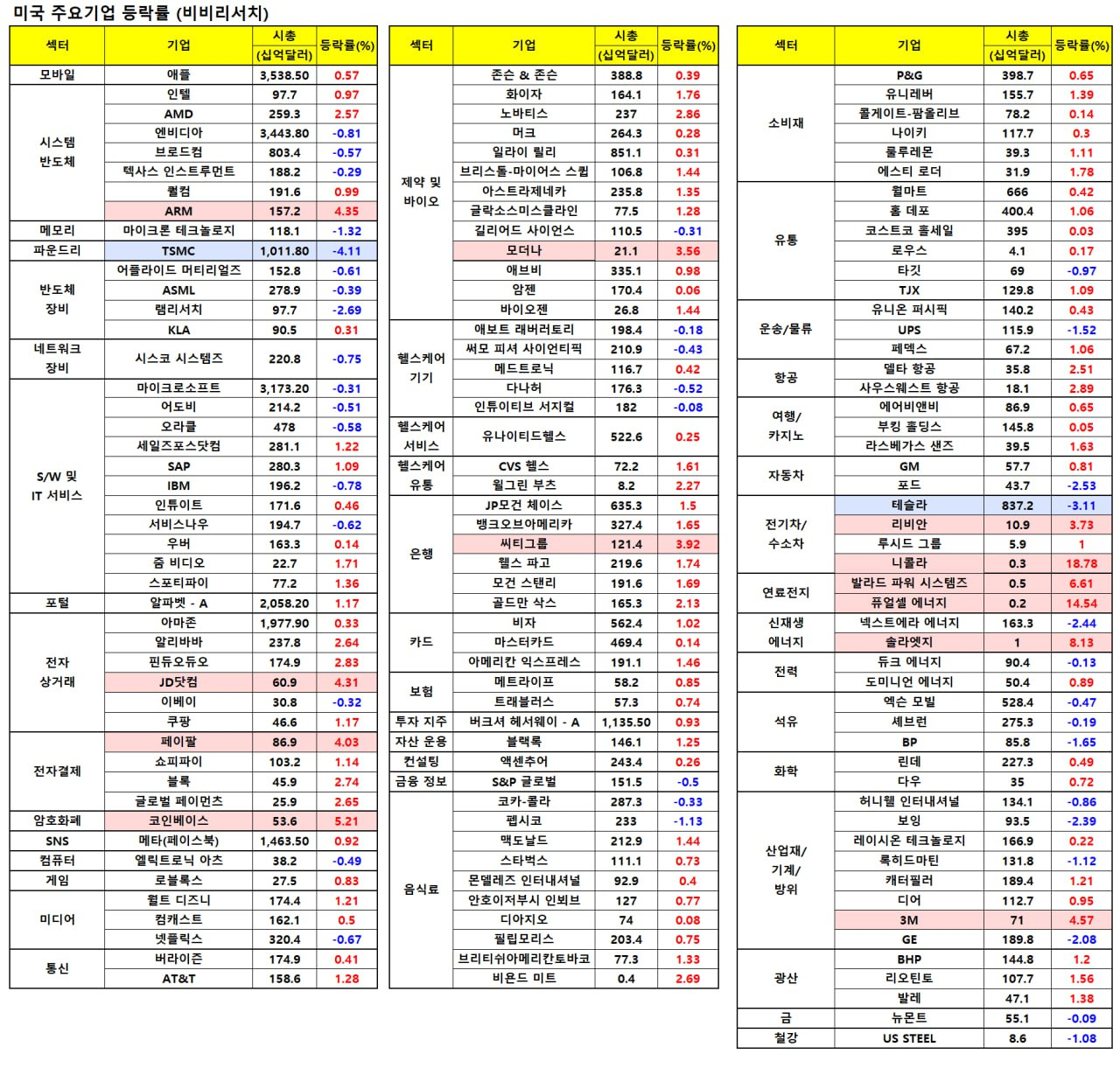 - 3M(+4.44%)은 JP모건이 목표주가를 상향 조정하자 강세.