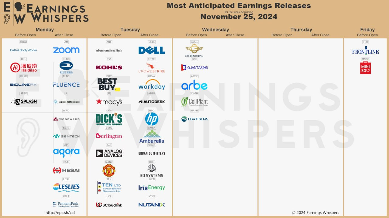 실적: 아나로그디바이스(ADI), 델 테크(DELL), 크라우드스트라이크(CRWD), HP(HPQ), 워크데이(WDAY), 메이시스(M), 노드스트롬(JWD), 어반아웃피트(URBN), 구스(GES), 베스트바이(BBY) - 11/27(수)