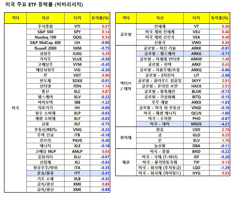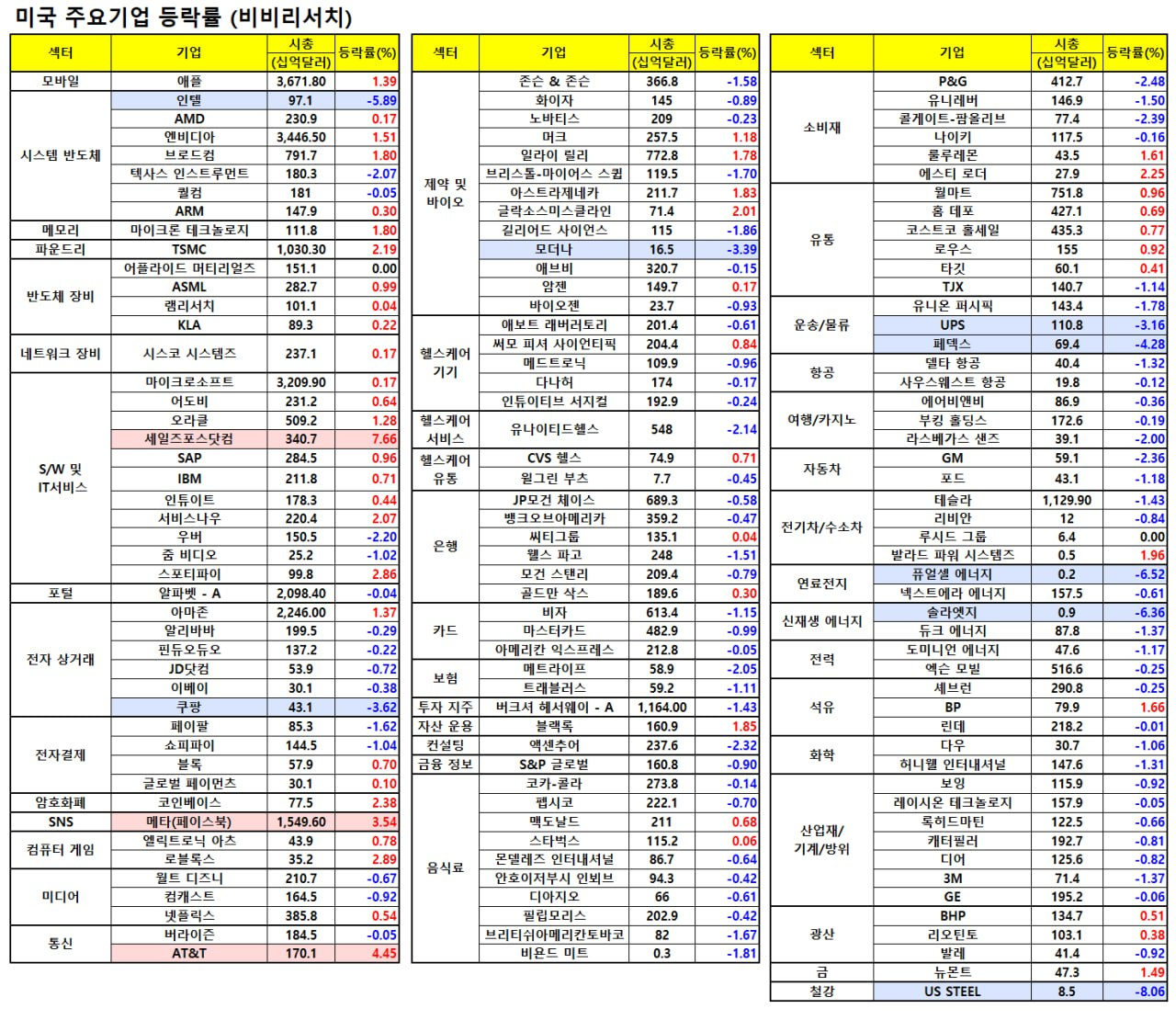- 물류회사인 페덱스(-4.66%)는 번스타인이 투자의견을 하향 조정하자 하락.