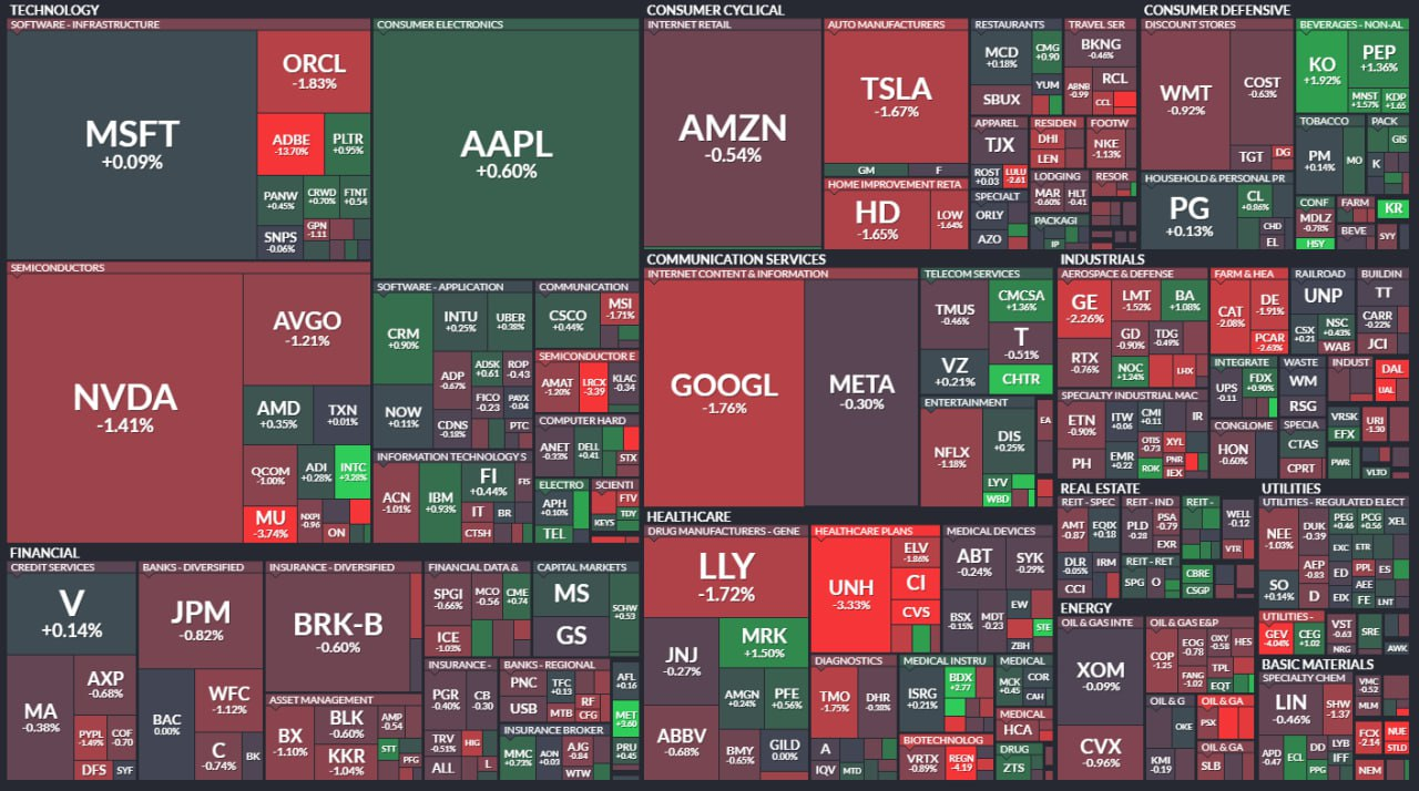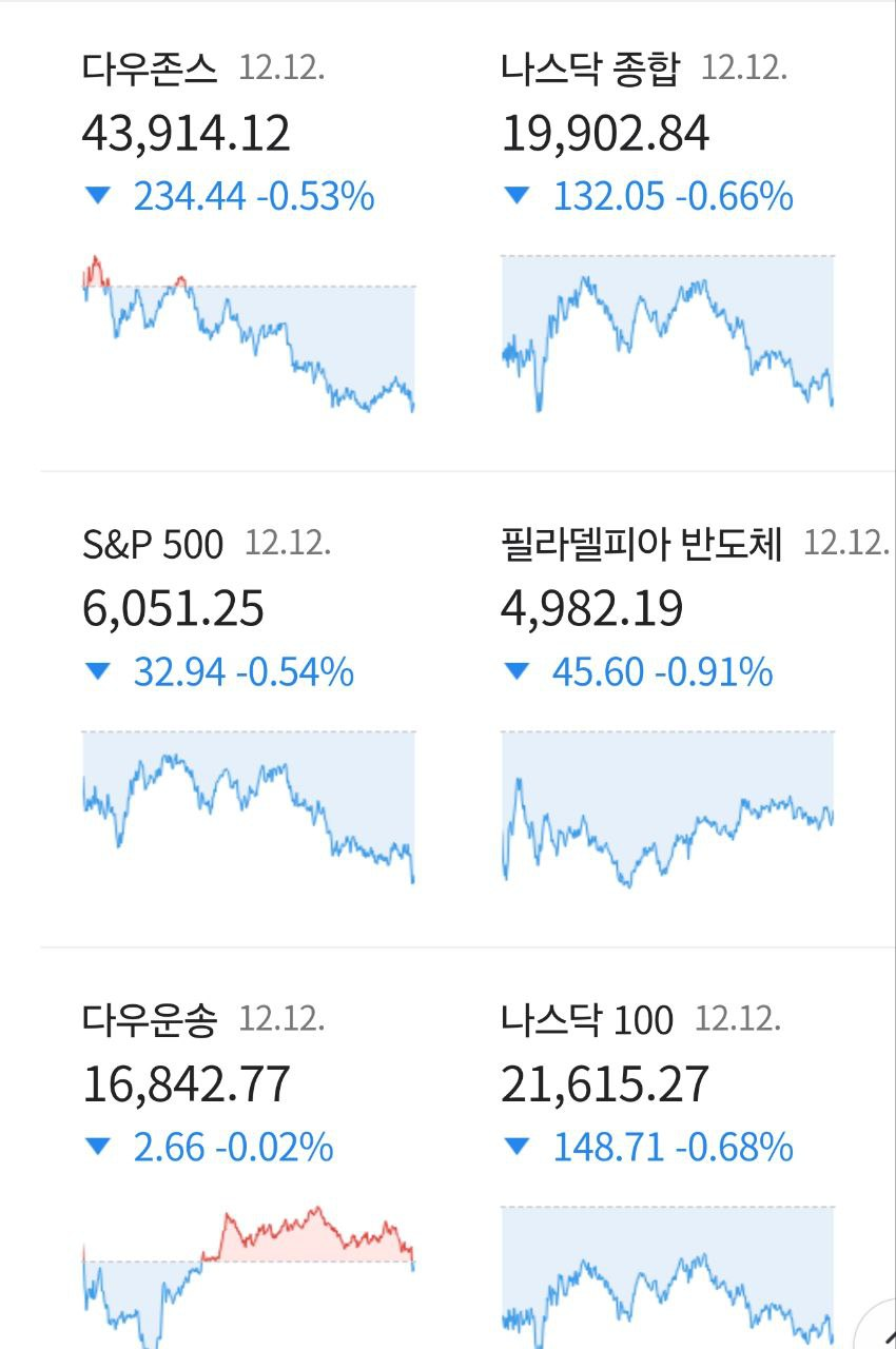 - - 엔비디아가 1% 이상 떨어졌고, Adobe는 예상보다 약한 2025년 전망에 13% 이상 하락. 그 밖에 메타, 알파벳, 아마존 등의 대형 기술주들도 약세를 보임.