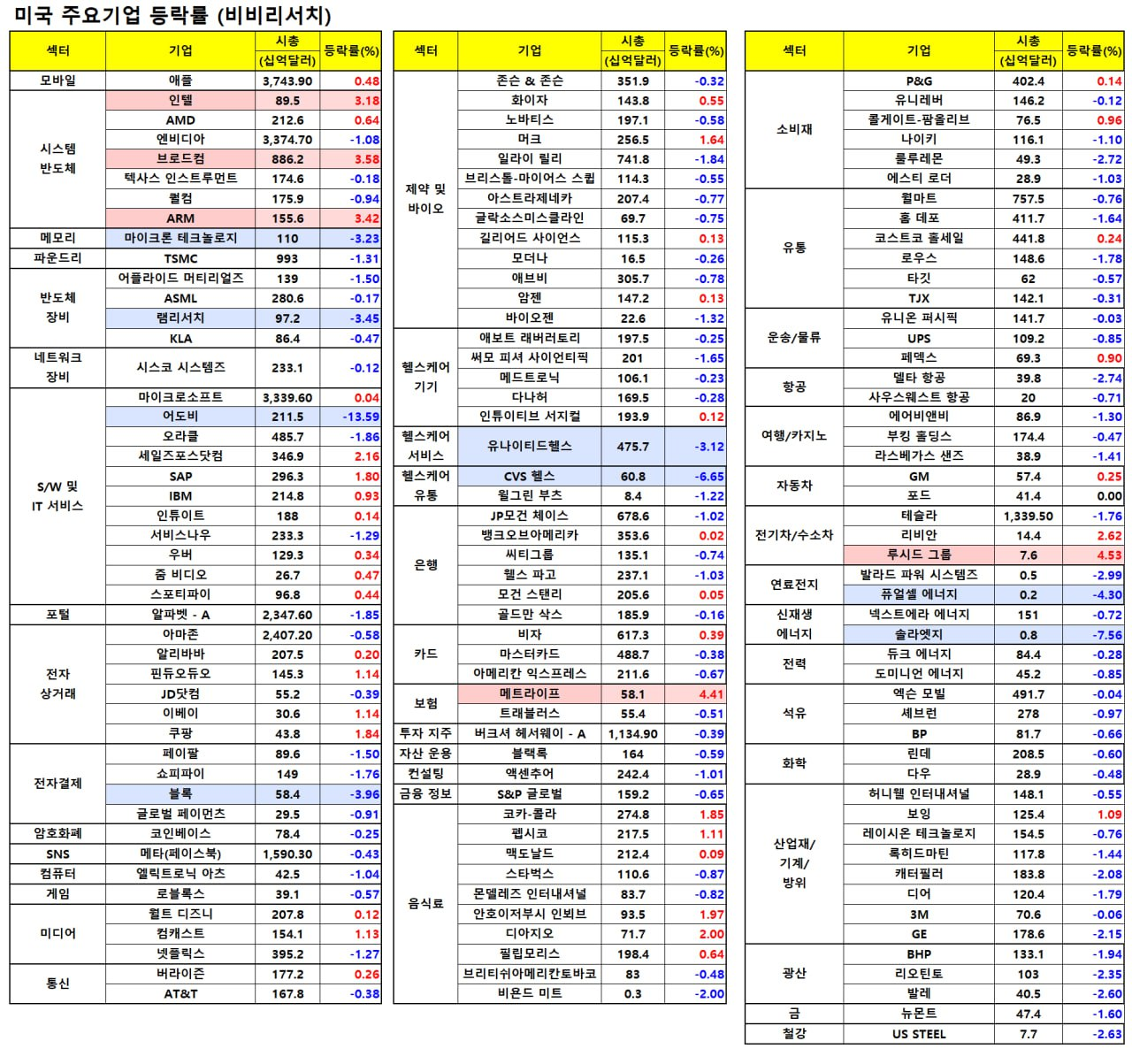 - 어도비(-13.69%)는 향후 전망에 대해 부정적으로 발표하자 큰 폭 하락.