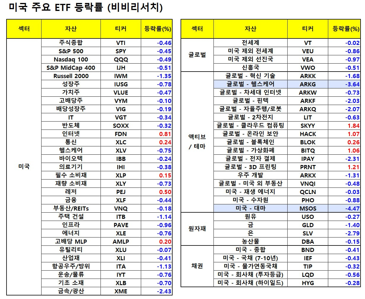 - 유나이티드헬스(-3.33%), CVS헬스(-4.21%), 시그나(-3.76%) 등 헬스케어 업종은 전일 제기된 일부 의원들이 관련 기업들이 가지고 있는 약국 체인 부문 매각 주장 소식에 하락 지속.