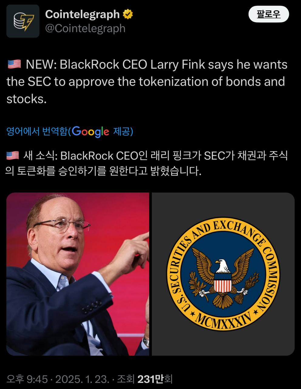 - [美 증권사 찰스 슈왑 CEO "암호화폐 현물 서비스 제공 허용 기대"]