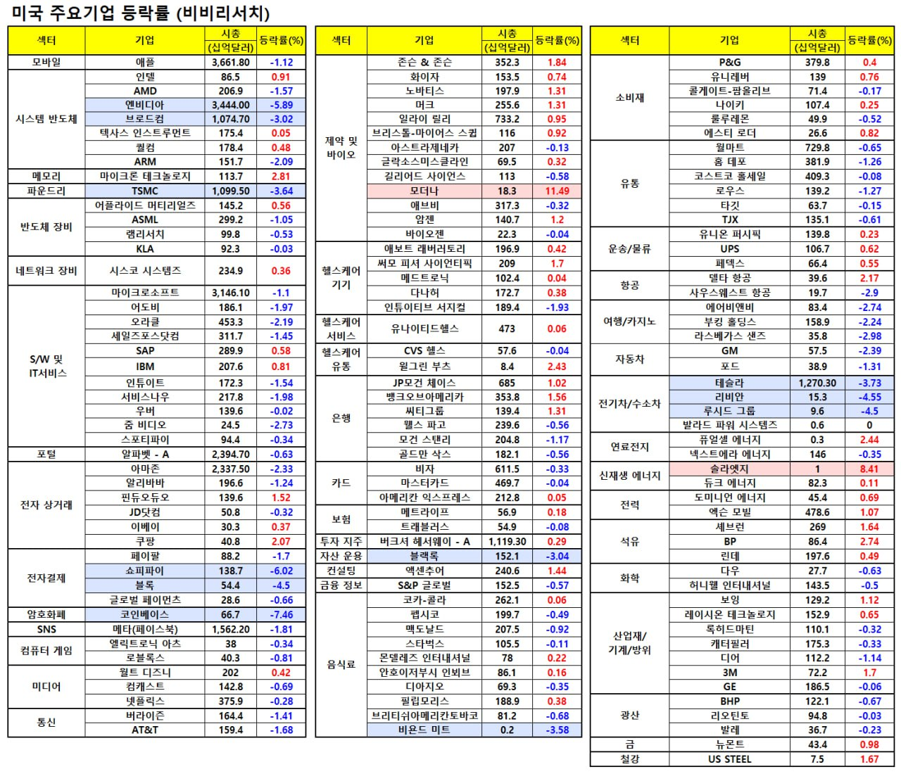 - 특히 금리 급등하자 본격적으로 매물 출회. TSMC(-3.90%), 브로드컴(-3.29%), AMD(-1.71%)도 하락 전환.