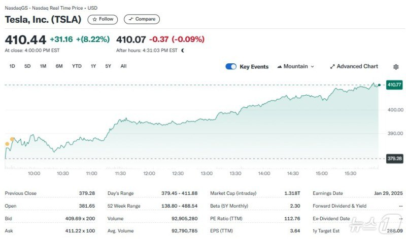 - 6% 빠졌던 테슬라 하룻새 8% 반등…주당 400불 돌파