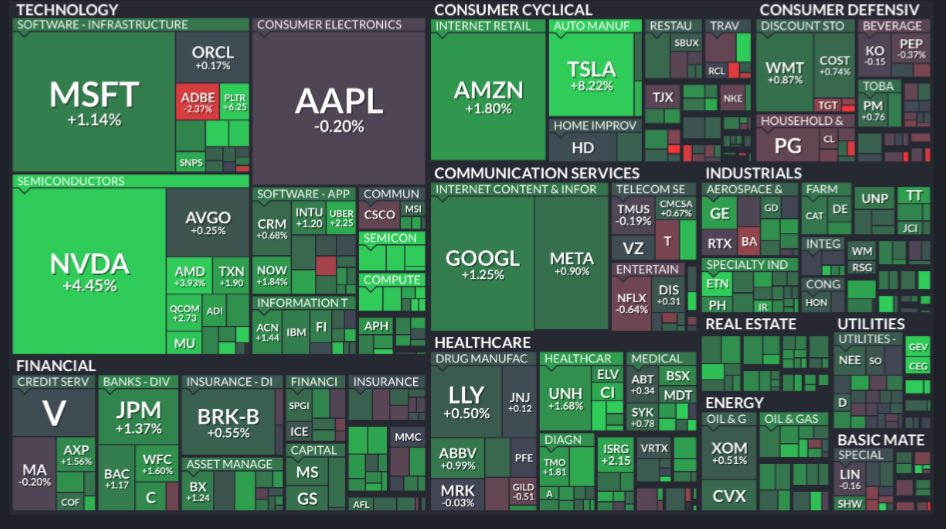 - 특히 주간 옵션 만기를 맞은 수급적인 영향과 엔비디아(+4.45%), 테슬라(+8.22%)가 상승을 견인 후 지수 상승세가 지속.