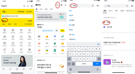 사진 상단에 돋보기클릭후 “배송” 검색을하면 카카오페이 서비스에 배송이 뜬다.