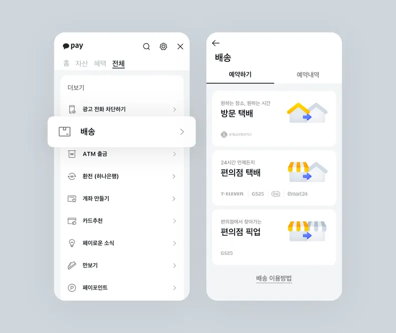 카카오페이앱 > 전체보기 > ‘더 보기’에서 ‘배송’