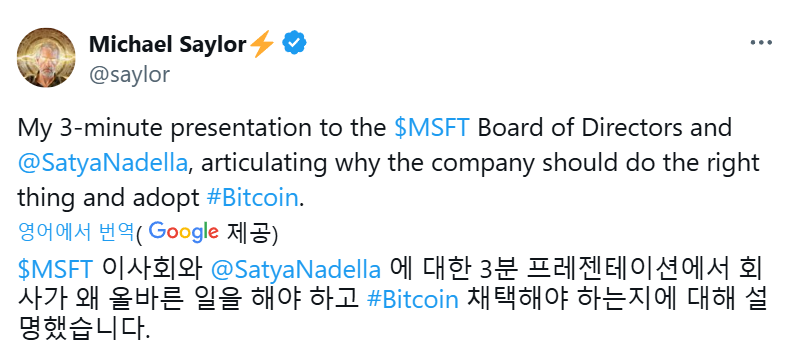 - 단일 기업 기준 가장 많은 비트코인을 보유 중인 마이크로스트래티지(MicroStrategy, 나스닥 티커: MSTR) 설립자 마이클 세일러가 X(구 트위터)를 통해 "마이크로소프트 이사회를 만나 3분간 프레젠테이션을 진행