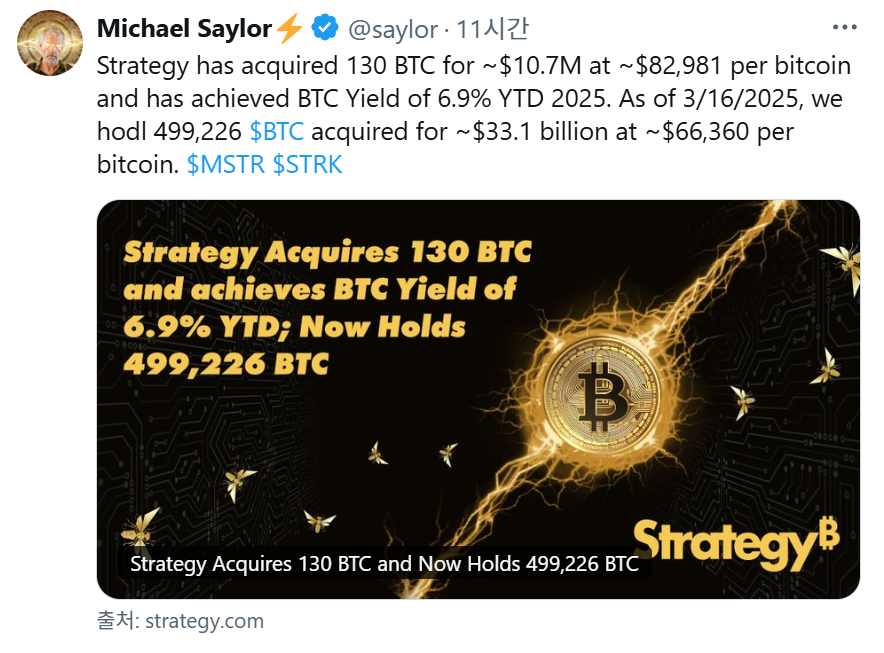 - 17일(현지시간) 세일러는 마이애미에서 열린 '퓨처 프루프 컨퍼런스'에서 CNBC와 인터뷰하면서 "시장은 관세 문제로 인해 극도로 신경이곤두서 있으며 금리는 30~50bp 하락한 상태"라며 "지금은 거시적으로 위험 회피 구간이지만, 이 국면이 전환되면 비트코인은 폭발적으로 상승할 것"이라고 말했다.