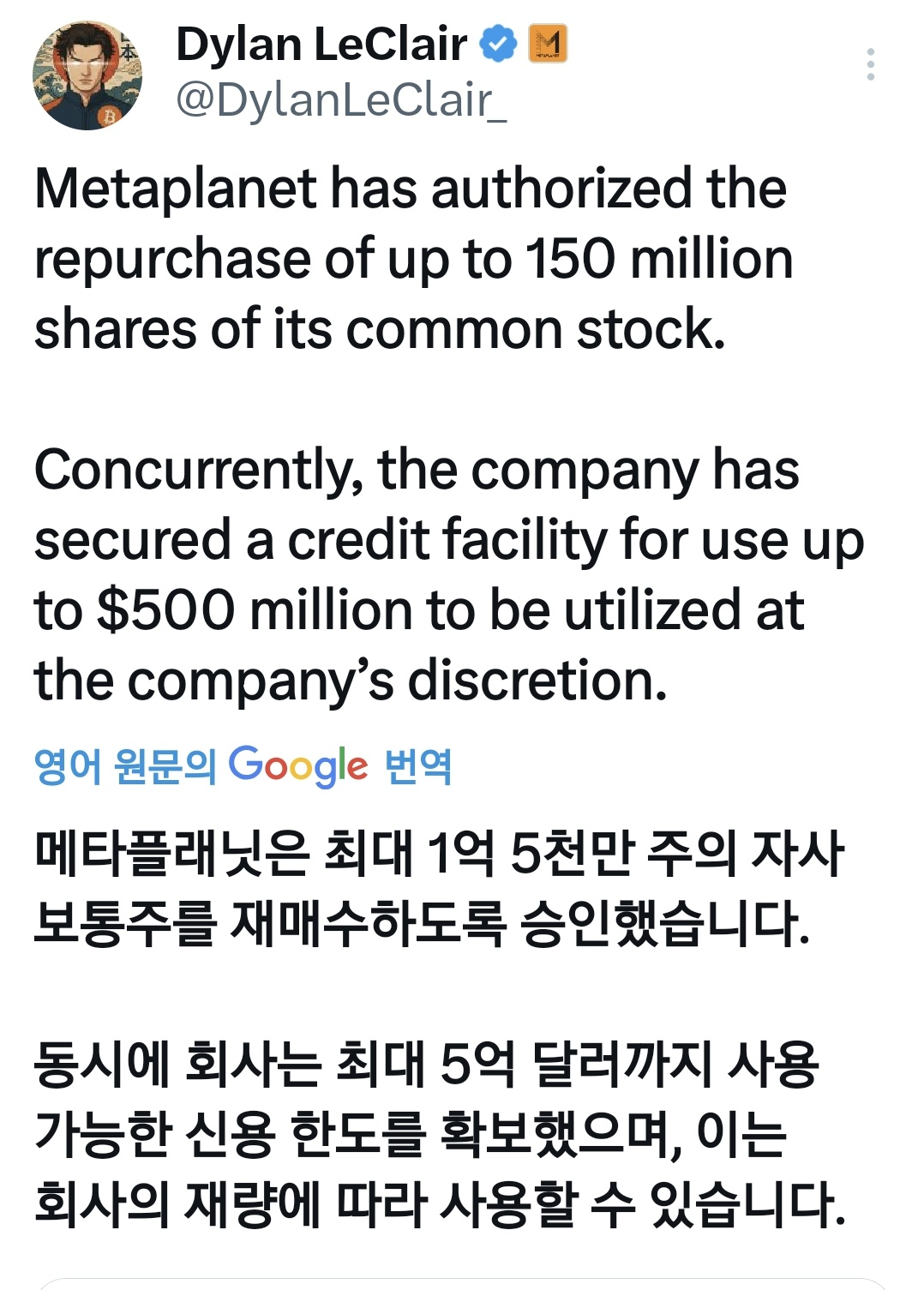 비트코인을 주요 자산으로 편입한 일본 상장사 메타플래닛의 CEO 사이먼 게로비치(Simon Gerovich)가 X를 통해 "BTC 수익 극대화를 위해 자사주를 바이백할 계획이다. 이사회에서 해당 계획을 승인했다"고 전했다. 바이백 물량은 보통주 1억 5000만주(4.95억 달러)다.