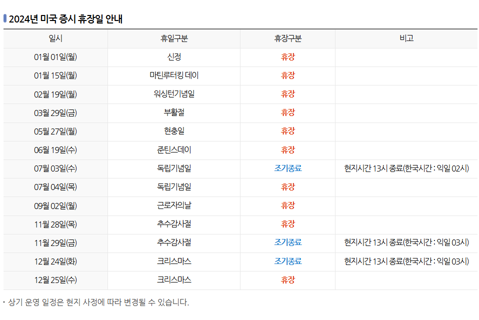 - 미국 증시는 29일 금요일에는 개장하지만 블랙 프라이데이로 오후 1시(한국시간 29일 오전 3시)에 조기 폐장한다.