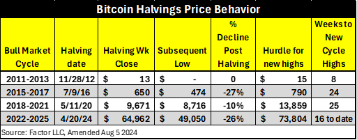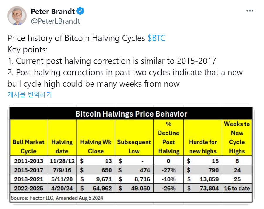 - 그는 8월 5일(현지시간) X에 올린 게시물에서 "반감기 이후 비트코인 하락세가 2015~2017년 반감기 강세장 사이클과 비슷해졌다"고 말했다.