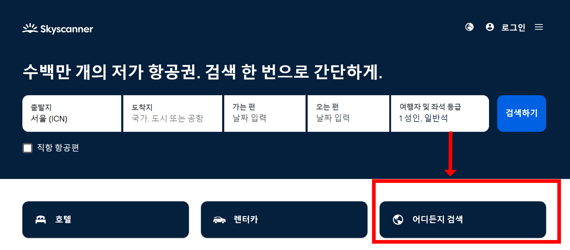 - 떠날 날짜는 정해졌는데 어디를 가야 할지 갈피가 잡히지 않거나, 어디라도 떠날 수 있는 모험가 타입이라면 스카이스캐너의 ‘Everywhere’ 검색 기능을 사용해보자.