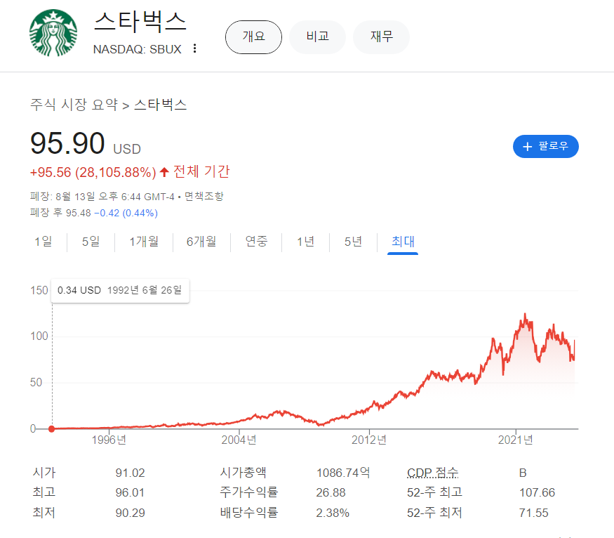 - 스타벅스가 투자자들에게 이같은 소식을 공개한 뒤 개장전부터 16% 강세를 보인 주가는 이날 하루 24.5% 뛰었고, 최고경영자를 뺏긴 치폴레 주가는 -7.5% 약세를 보였다.