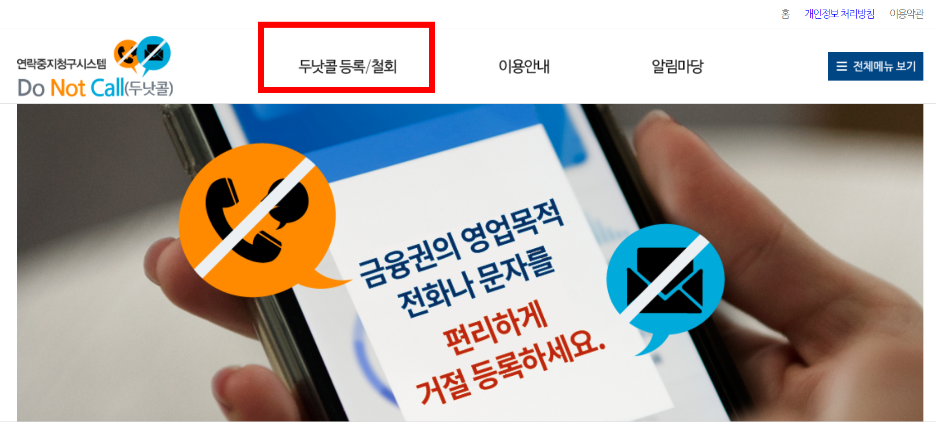 - 고객이 금융회사의 영업 목적의 광고성 휴대폰 전화와 문자 메시지에 대한 수신거부 의사를 밝히면 금융회사로부터 영업 목적 연락을 전면 차단하는 시스템입니다.