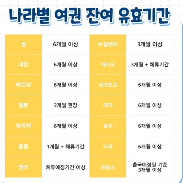대부분 6개월 이상의 잔여 유효기간을 필요로 하고 있어 여행일 기준 여권 잔여유효기간이 6개월 이내일 경우 필수로 재발급을 받으셔야 출입국 시 거절당하지 않을 수 있습니다.