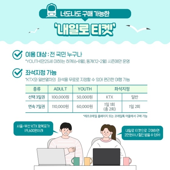 전 연령 대상 내일로 패스 1만 원 할인 (선택 3일권, 연속 7일권)