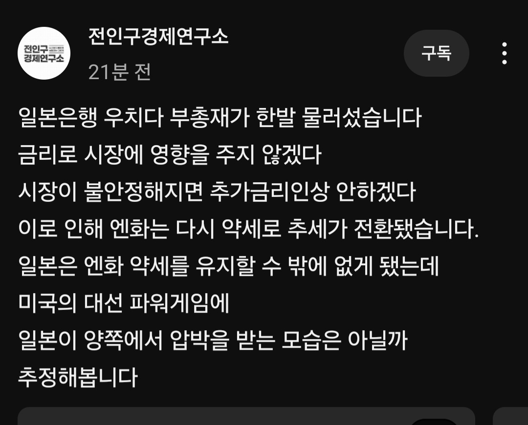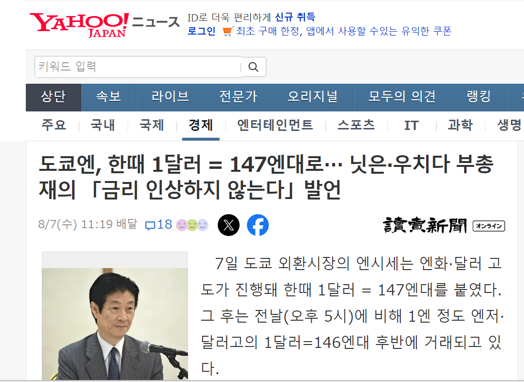 - 외신에 따르면 일본은행 부총재 우치다 신이치가 "현재 필요한 것은 완화 정책 유지다.