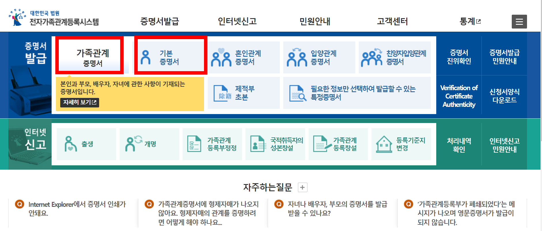- 부모와 자녀 간 관계 확인 (가족관계증명서 등록, 기본증명서 등록)