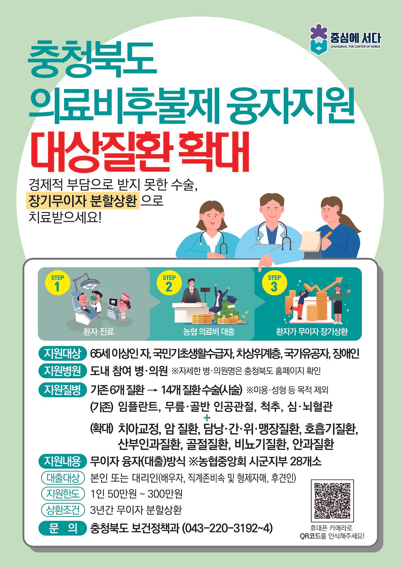 - 충북 내 지정 의료기관에서 임플란트와 척추, 심뇌혈관 등 14개 질환 치료를 받을 수 있습니다.