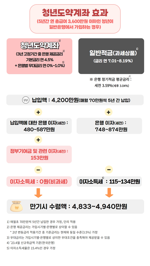 - 연 총급여 2400만원 이하인 청년이 일반 은행에서 청년도약계좌에 가입해 매월 70만원씩 납입하면